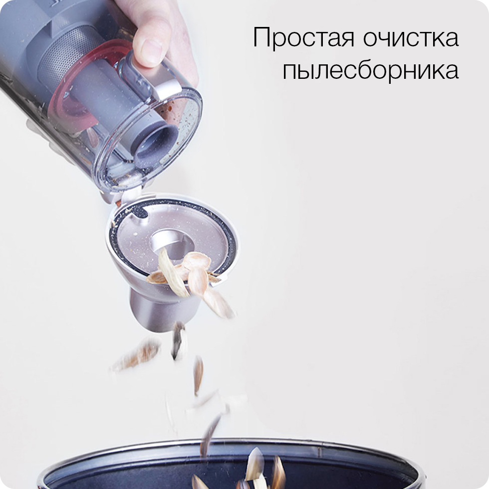 Особая двухступенчатая конструкция пылесборника позволяет использовать его объем с максимальной пользой. Чтобы опустошить первую ступень, достаточно лишь слегка повернуть крышку, а вторая ступень (Возле двигателя) открывается простым нажатием на кнопку, после чего ее можно опустошить прямо в мусорное ведро.