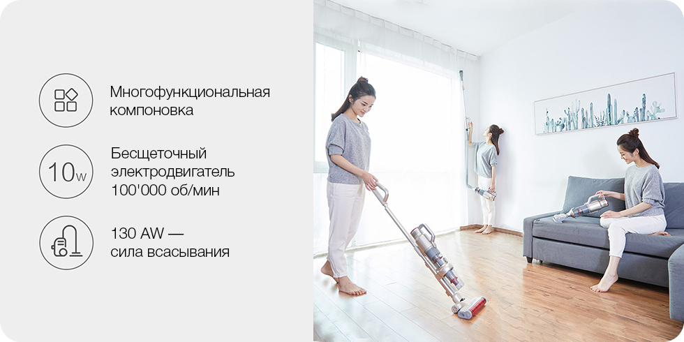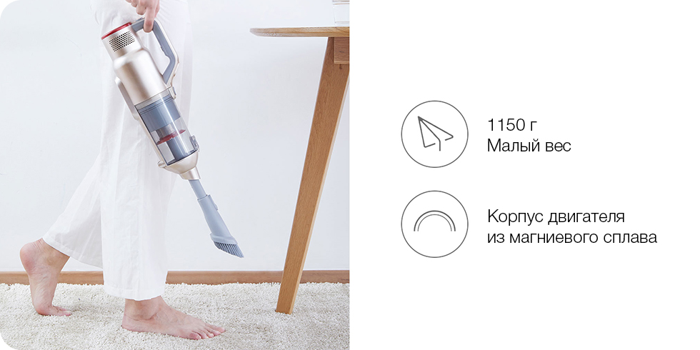 После полной очистки пола от пыли достаточно нажать всего одну кнопку, чтобы снять двигатель и подсоединить к нему другие насадки, сделав из полового пылесоса мобильный. С разными насадками, шлангом или съёмной металлической трубкой можно собирать варианты под решение разных задач, чтобы убрать пыль из-под кровати, из узких щелей, из кондиционера и других мест.
