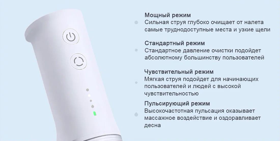 Портативный ирригатор обладает следующими функциями: Глубокая очистка. Это возможность удалить застарелый зубной налет всего за 2 минуты. Таймер работы. Вам больше не нужно засекать время на гигиену зубов, через 2 минуты портативный ирригатор для полости рта самостоятельно прекратит работу. Регулировка давления струи поможет выбрать оптимальный режим здесь и сейчас. Максимальное давление достигает 140 psi даже при низком заряде аккумулятора.