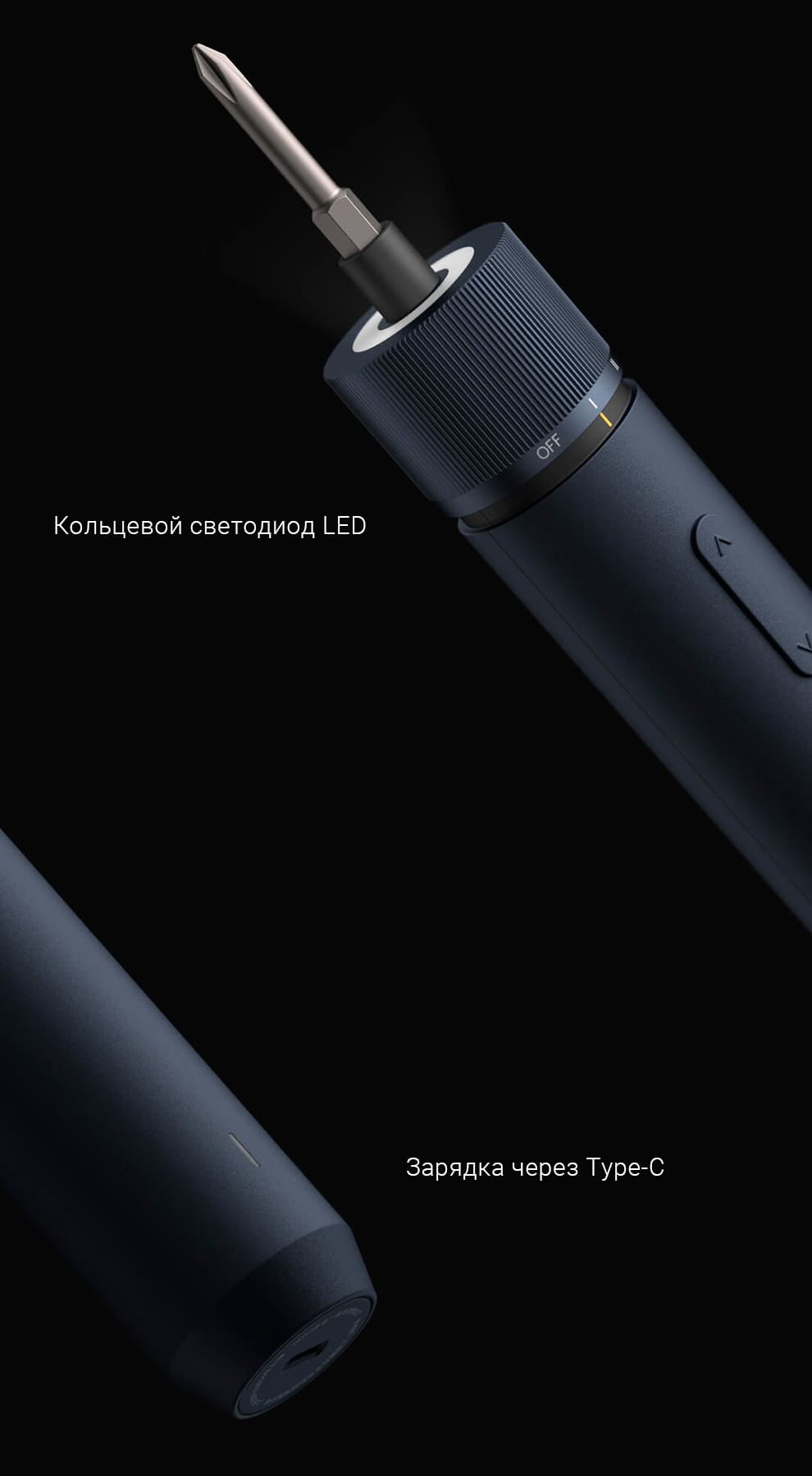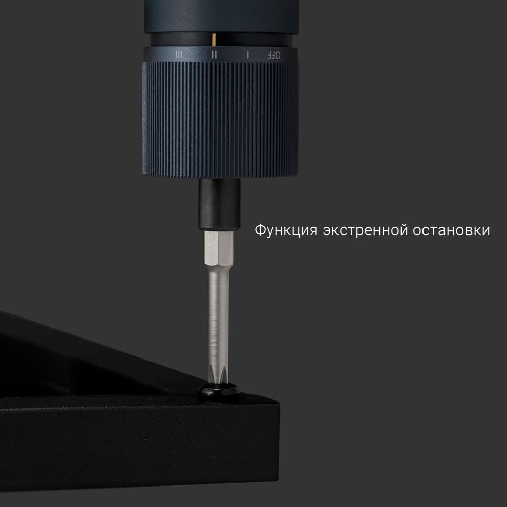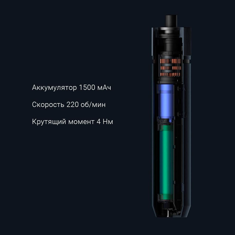 На корпусе гаджета находится кольцевой светодиод, который отключается автоматически. Он отлично помогает использовать устройство в условиях слабой освещенности. Отвертка заряжается через порт Type-C менее, чем за 150 минут.