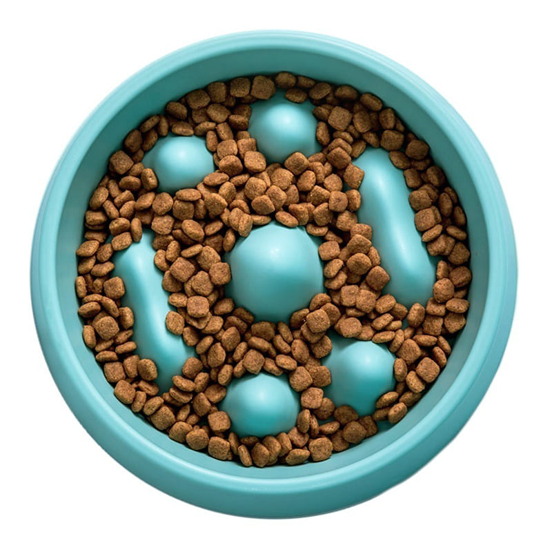 Дно миски с «горными» выступами имитирует природный неровный рельеф земли. Миска естественным образом вынуждает питомца снижать скорость потребления пищи и тщательнее пережевывать её. Это научно доказанный способ защитить здоровье любимца.
